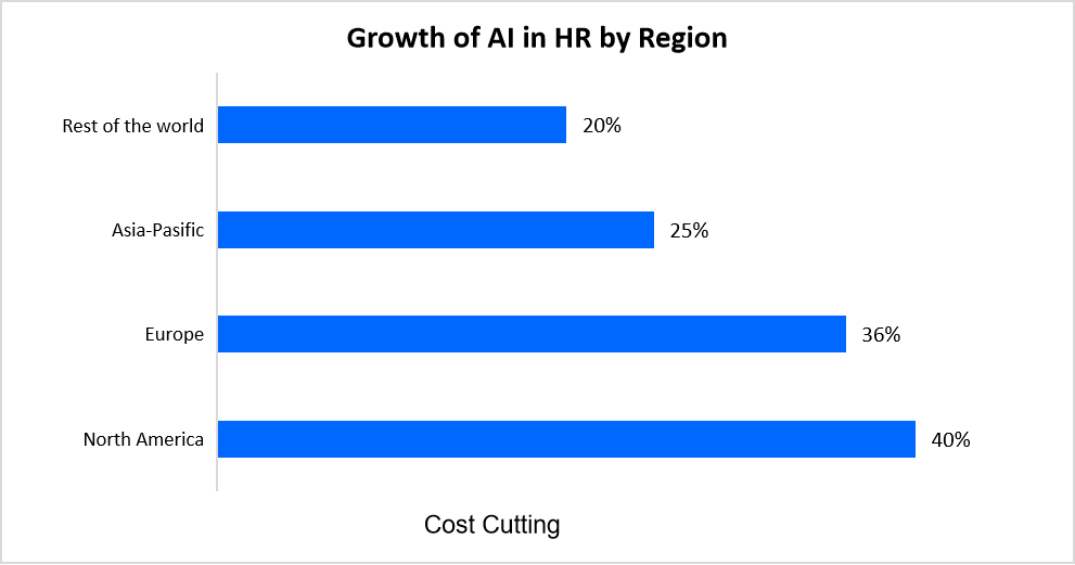North America leads the charge with a whopping 40% cost reduction, followed closely by Europe at 36%. Interestingly, the Asia-Pacific region and the rest of the world are also catching up swiftly, with 25% and 20% cost-cutting measures, respectively. This data underscores the transformative power of AI in revolutionizing HR processes globally.