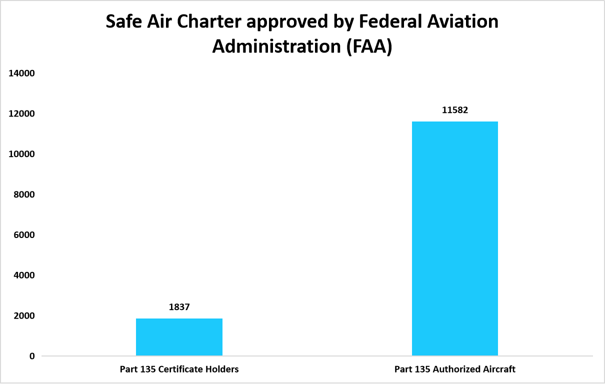 The following graph represent the number of authorized aircraft and certified holders for air charter services as they are Part 135 certified by the "Federal Aviation Administration (FAA)", this allows this aircraft to operate as a non-scheduled air charter carrier, encompassing regulations for on-demand jet charters.