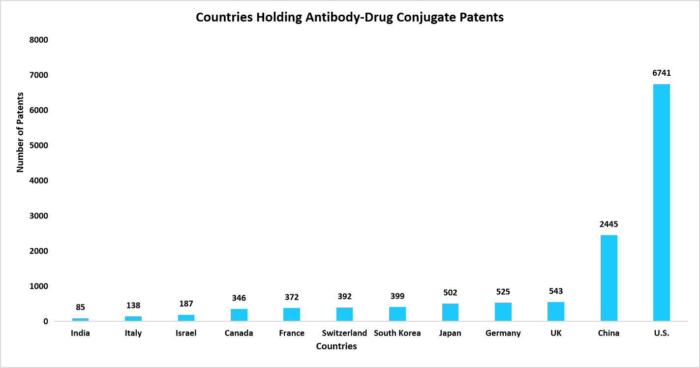 Below graph represents the total number of antibody-drug conjugate patents held by various countries;