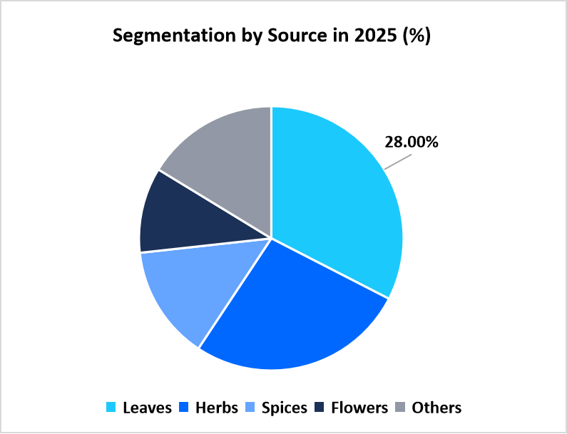 Flowers represent the fastest-growing source segment, expanding at a CAGR of 10.64%, driven by consumer preference for calming, anti-inflammatory, and aromatherapeutic botanical ingredients. Floral extracts are gaining traction in stress-relief blends, sleep-enhancing formulations, and immunity boosters. Their functional versatility and premium positioning appeal to wellness brands seeking differentiation. Increasing scientific validation of chamomile, hibiscus, and lavender further accelerates adoption, strengthening growth across both nutraceutical and herbal remedy applications.