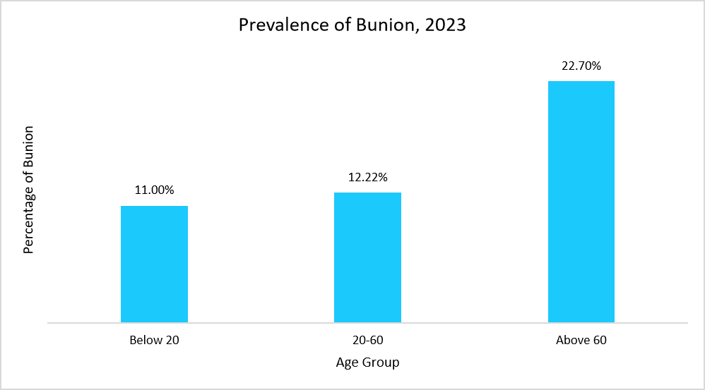 The below graph shows the rising prevalence of bunions in 2023