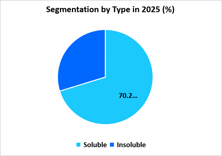 The soluble segment held a 70.23% share in 2025, driven by its superior water-binding and stabilizing properties. Widely used in food and beverages for clean-label formulations, it enhances texture and viscosity. Rising replacement of synthetic additives with plant-based alternatives continues to fuel this segment’s dominance globally.