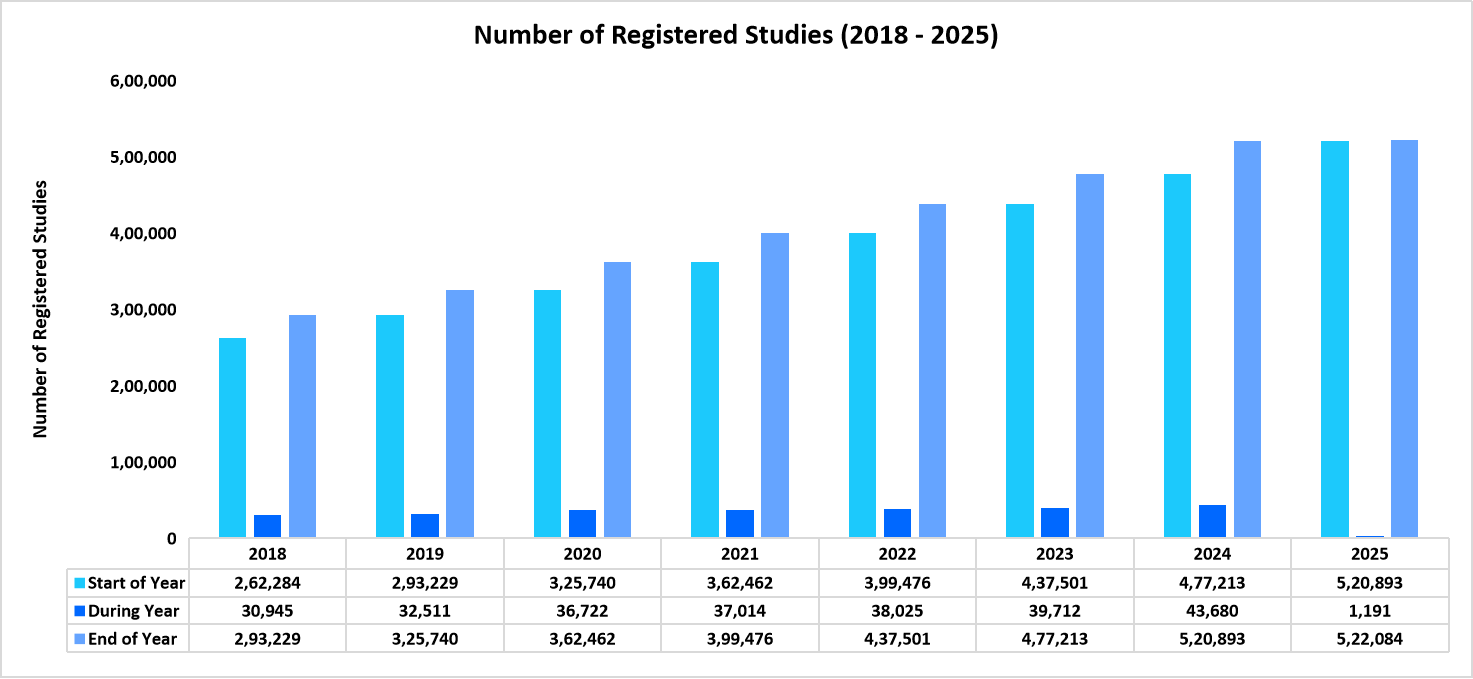 The number of registered clinical studies from 2018 to 2025 depicting a growth of 8.18% from 2019 to 2025 (to date)