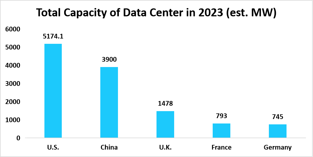The below graph shows the estimated total data center capacity (in MW) for major countries in 2023, highlighting the U.S., China, the U.K., France, and Germany.
