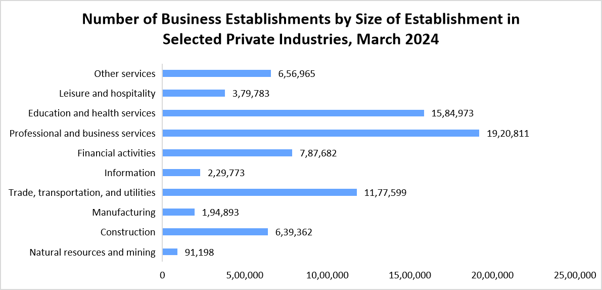 The below depicts employment distribution across various sectors, with the "Professional and business services" sector having the highest number of employees (1,920,811) and "Natural resources and mining" having the lowest (91,198). It shows that industries like "Education and health services" and "Trade, transportation, and utilities" also have significant employment numbers, while others like "Leisure and hospitality" and "Manufacturing" fall in between.