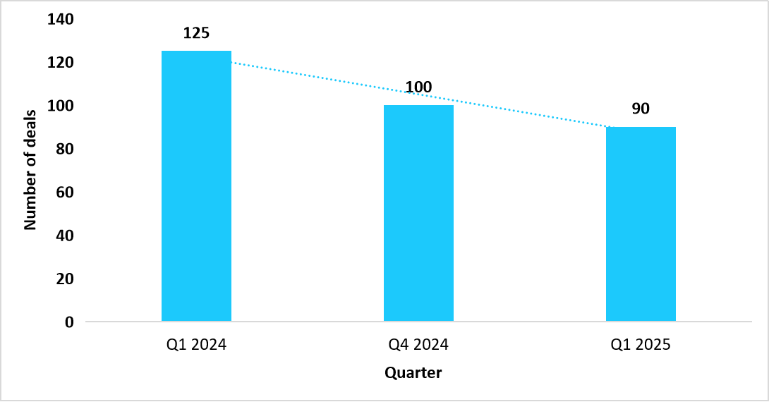 Dealmaking activity in advanced molecular therapies is showing signs of moderation, with fewer financing rounds, strategic alliances, and collaborative agreements observed in early 2025. According to the American Society of Gene & Cell Therapy, dealmaking for advanced molecular therapy companies declined in Q1 2025, as illustrated in the graph below: