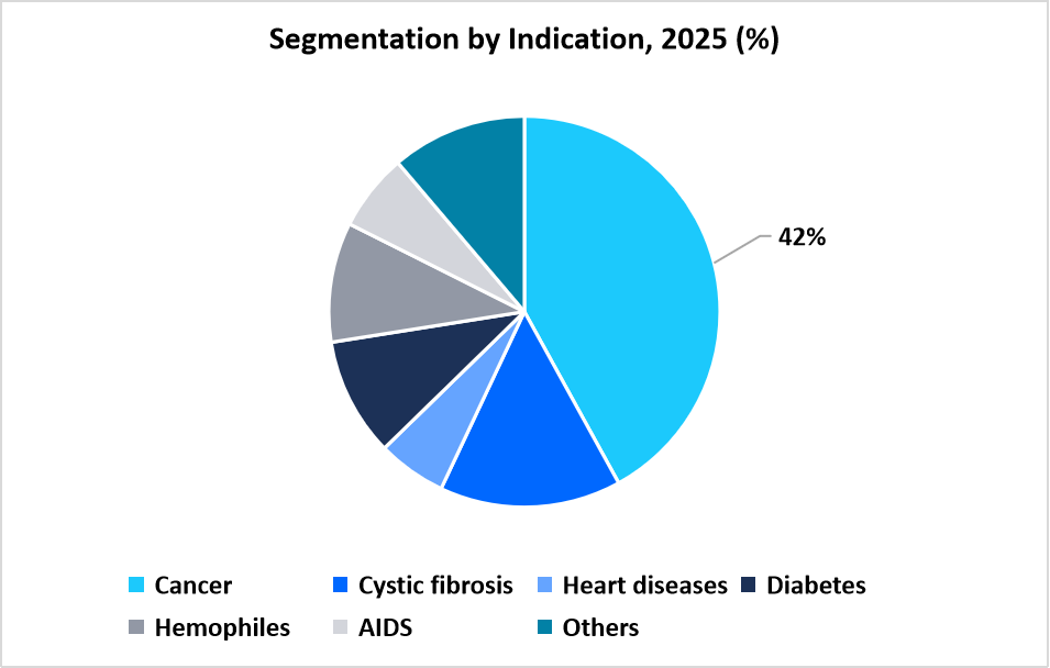 The cancer segment dominated the market with a revenue share of 42% in 2025. The growth is attributed to rising prevalence of various cancer, which increases the need for targeted and personalized therapies.