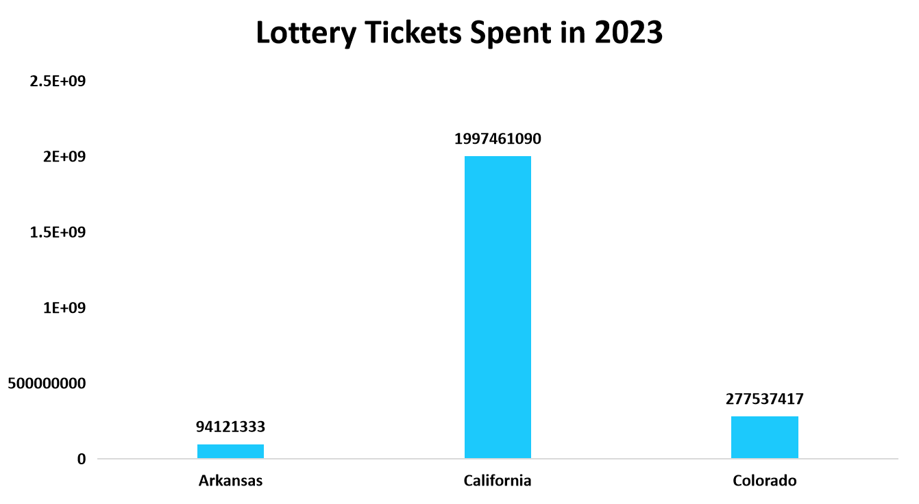 California has the highest spending, which is significantly ahead of Arkansas and Colorado. This indicates how the lottery industry may differ significantly between states due to the influence of factors such as population size, state policies, and local preferences. Data further suggests that states with higher spending will experience greater market activity and higher revenue generation through lottery sales.