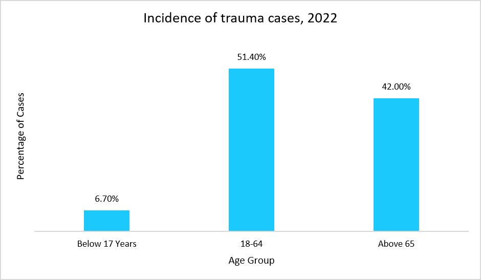 According to the data mentioned above, in 2022, the 18-64 age group accounted for the highest number of trauma incidence cases, representing 51.40% of total cases. The surge in trauma cases is primarily driven by road accidents, falls, workplace injuries, sports incidents, and natural disasters, significantly increasing the demand for advanced wound care solutions, including medical tapes and bandages.