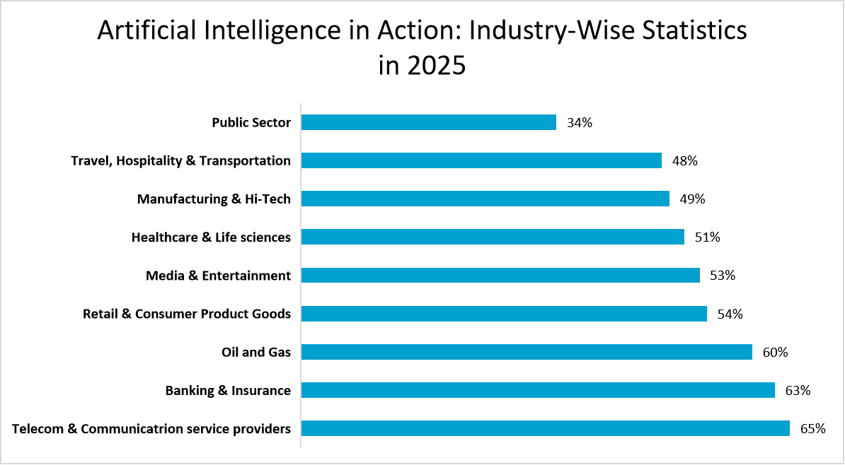The below depicts the varying levels of digital transformation adoption across different industries, with Telecom & Communication service providers leading at 65% and the Public Sector at the lowest with 34%. It highlights that industries such as Banking, Oil and Gas, and Retail are also significantly engaged in digital transformation, while sectors like Public Sector and Travel show relatively lower engagement.