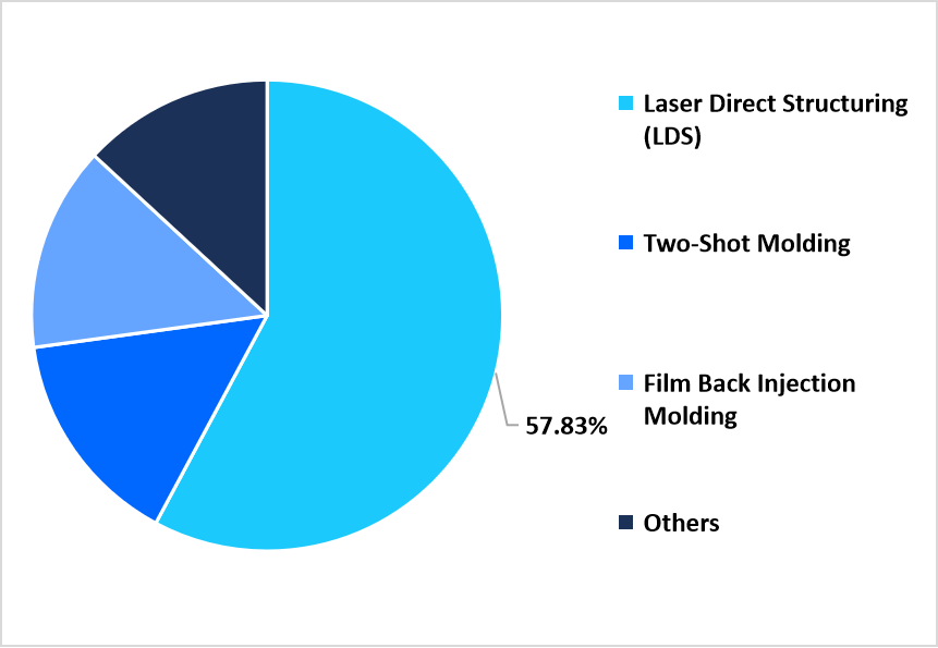 The laser direct structuring (LDS) segment accounted for 57.83% of revenue in the market in 2025. Its high growth is attributed to its greater precision in making complex 3D circuitry on molded plastic parts to reduce the complexity in the integration of components and enhance the performance of signals across end verticals, including automotive electronics and telecommunications modules.