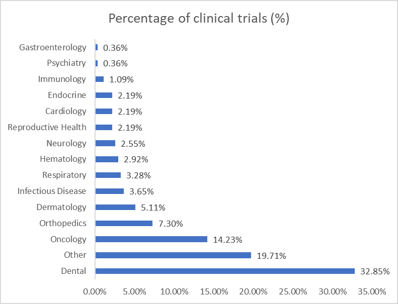 Additionally, the figure shows the distribution of clinical trials by percentage, with dental (32.85%) at the forefront of research focus. Increasing interest in targeted therapy and precision medicine fuels the demand for nanochips. Nanochips improve diagnostics, drug delivery, and personalized medicine and are essential to enhance treatment outcomes in priority research fields.