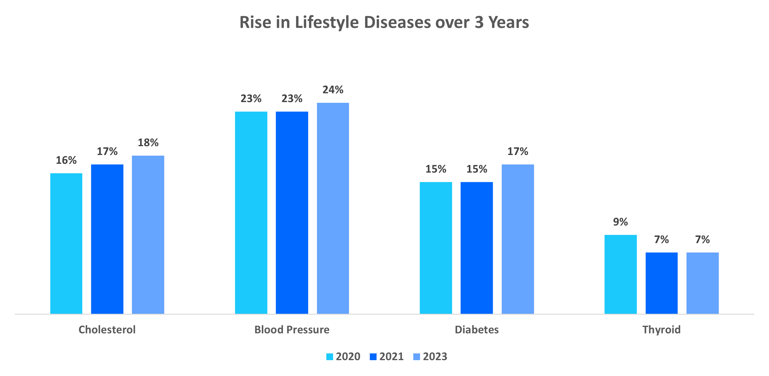 The below chart shows 3 years (2020-2022) prevalence of the most common lifestyle diseases