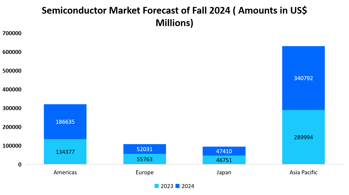 The below-mentioned graph of the Fall 2024 semiconductor market forecast reveals notable growth, particularly in Asia Pacific and the Americas.