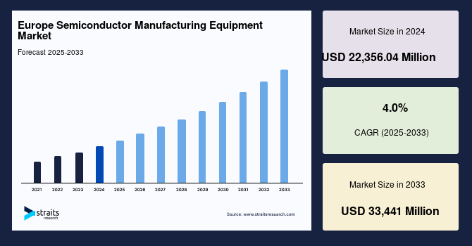 The Europe semiconductor manufacturing equipment market size was valued at USD 22,356.04 million in 2024 and is projected to reach from USD 23,203.06 million in 2025 to USD 33,441 million by 2033, growing at a CAGR of 4.0% during the forecast period (2025-2033).