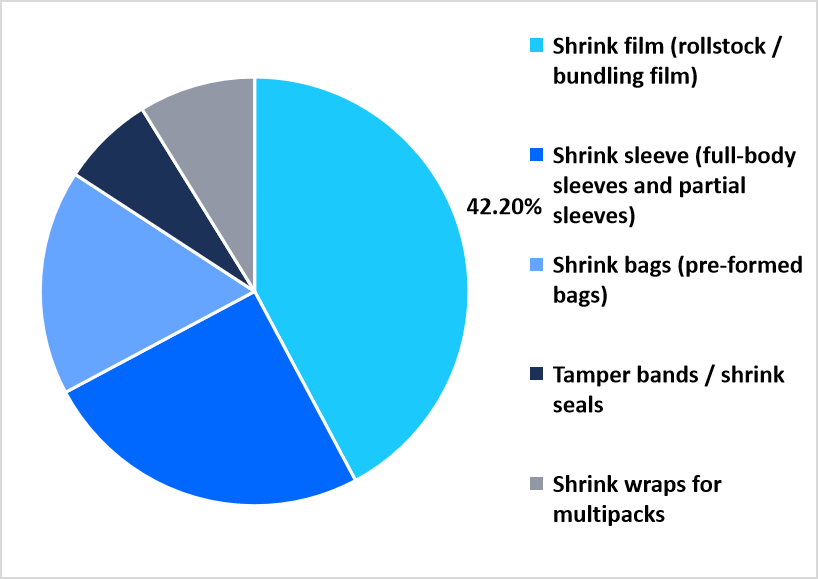 Shrink film as rollstock and bundling film dominated the market with a revenue share of 42.2% in 2025. As the foundational packaging format, rollstock is cost-effective, compatible with existing equipment, and essential for pallet consolidation and multipack assembly. Its versatility in formulation and gauge allows it to meet diverse industrial needs, guaranteeing consistent, high-tonnage consumption.