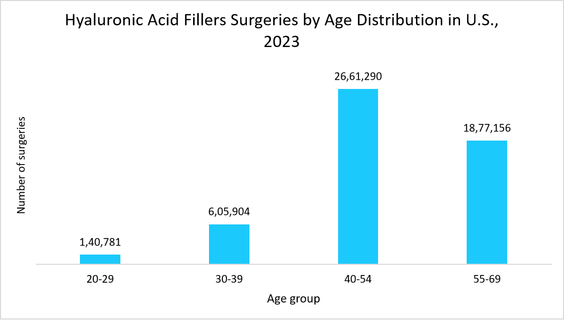 According to the above data, hyaluronic acid filler procedures in the U.S. in 2023 showed a higher demand among individuals aged 40-54. This trend reflects the growing preference for minimally invasive and long-lasting skin rejuvenation solutions, which are driving market growth. Moreover, the rising number of procedures highlights increasing consumer awareness, advancements in technology, and evolving beauty trends. These factors collectively contribute to the expanding market as more individuals seek effective and non-surgical treatments to maintain youthful, hydrated skin.