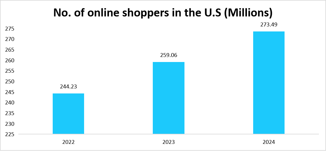 The below shows the number of online shoppers in the U.S. from 2022 to 2024, indicating a steady increase. Online shoppers grew from 244.23 million in 2022 to 273.49 million in 2024, reflecting the continued rise in e-commerce adoption.
