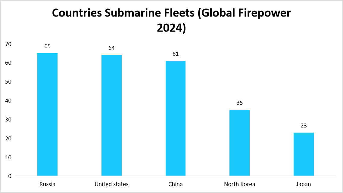 The below depicts the submarine fleet size of key countries, including Russia, the United States, China, North Korea, and Japan, as of 2024. This reflects that the more significant submarine fleets will be the demand drivers for the market to provide effective communication and operations for the extensive fleets of these nations.