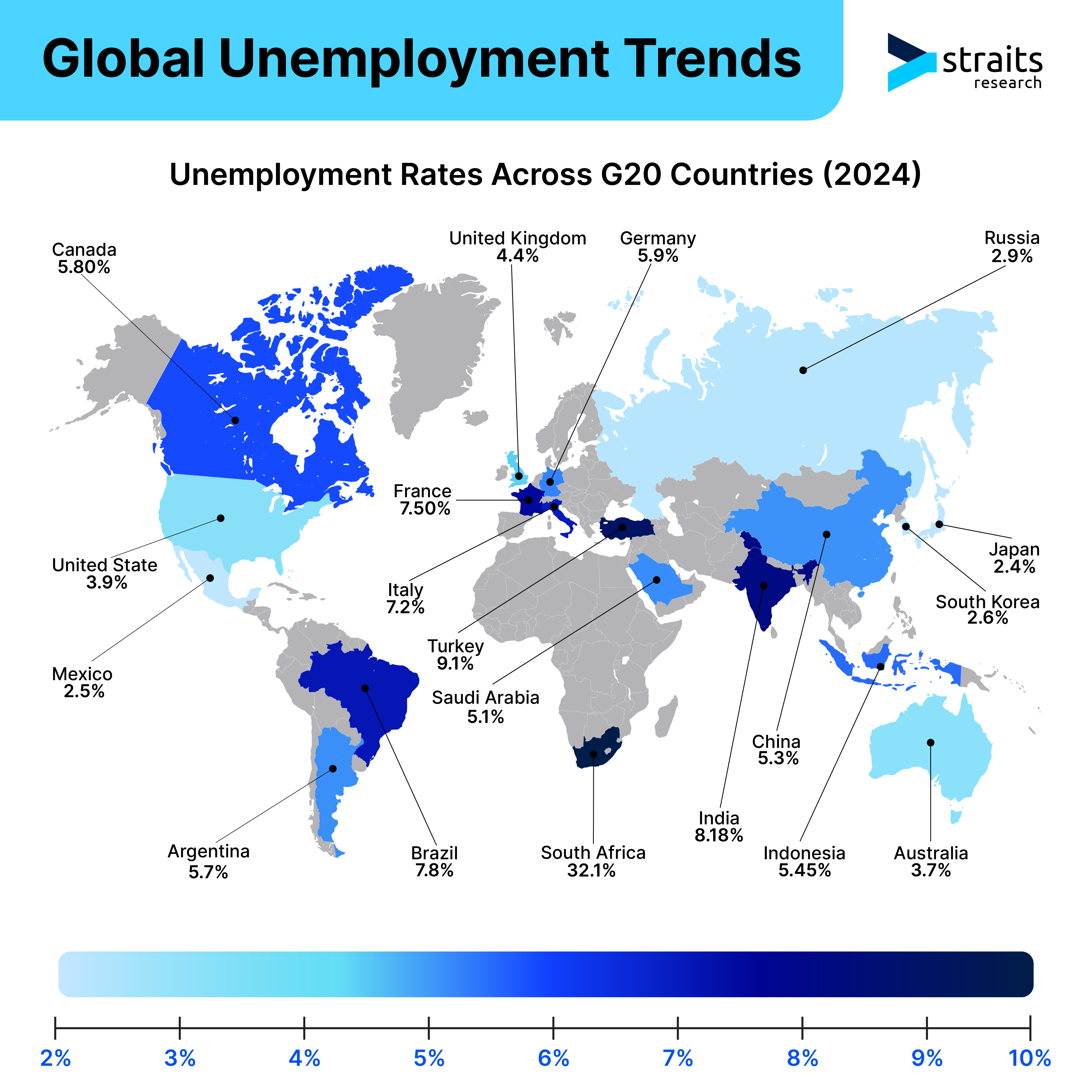 The rate of unemployment worldwide as of March 2024 is 5.2%. Disparities still exist among the G20 countries, nevertheless. With an alarming 32.1% unemployment rate, South Africa leads the list, while Japan has the lowest rate at 2.4%. The problem is worsened because job growth is often slower than GDP growth in many G20 nations, notwithstanding fluctuations. Moreover, in the G20 countries, youth unemployment rates are rising, particularly for those who have just finished high school.
